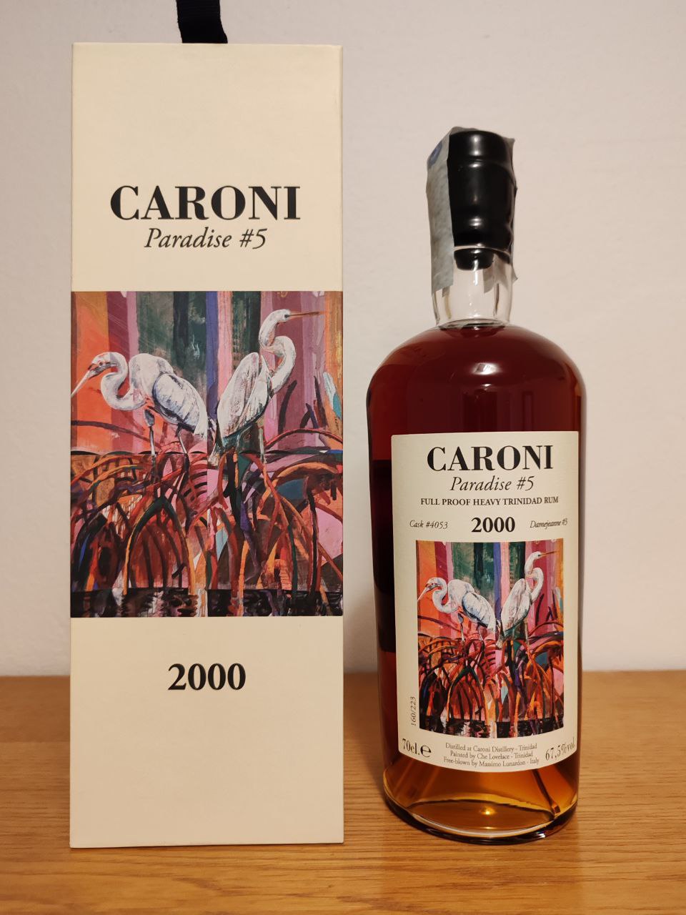 Zde vybraný sud je #4053 a pochází ze zásob, které po destilaci zůstaly na Trinidadu až do roku 2019. Po výběru byl dekantován do 3 skleněných demižonů o objemu 54 litrů – každý štítek uvádí číslo od #1 do #3.